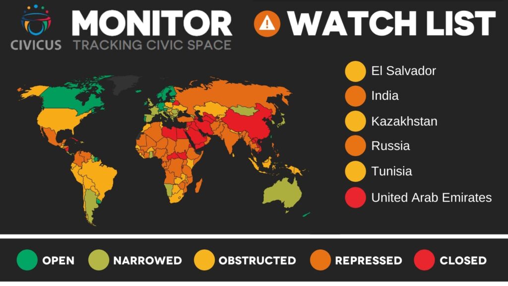 The new watchlist is released by the CIVICUS Monitor, an online platform that tracks the latest developments to civic freedoms, including the freedoms of expression, association and peaceful assembly, across 197 countries and territories. Other countries included on the watchlist are El Salvador, India, Tunisia, Russia and the United Arab Emirates.