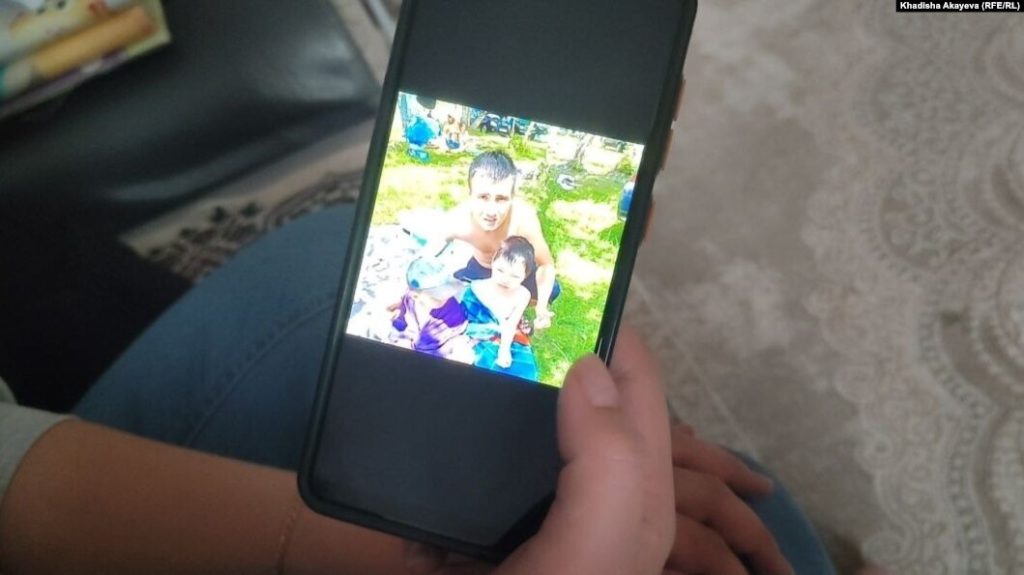 Мөлдір Қалиасқарова марқұм күйеуі Айдос Алдашовтың телефонда сақталған фотосын көрсетіп отыр.